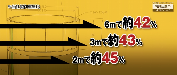 従来のロックピン式のケーシング(1000mm)と比較して、6mで約42%、3mで約43%、2mで約45%の軽量化を実現(当社製作重量比)。