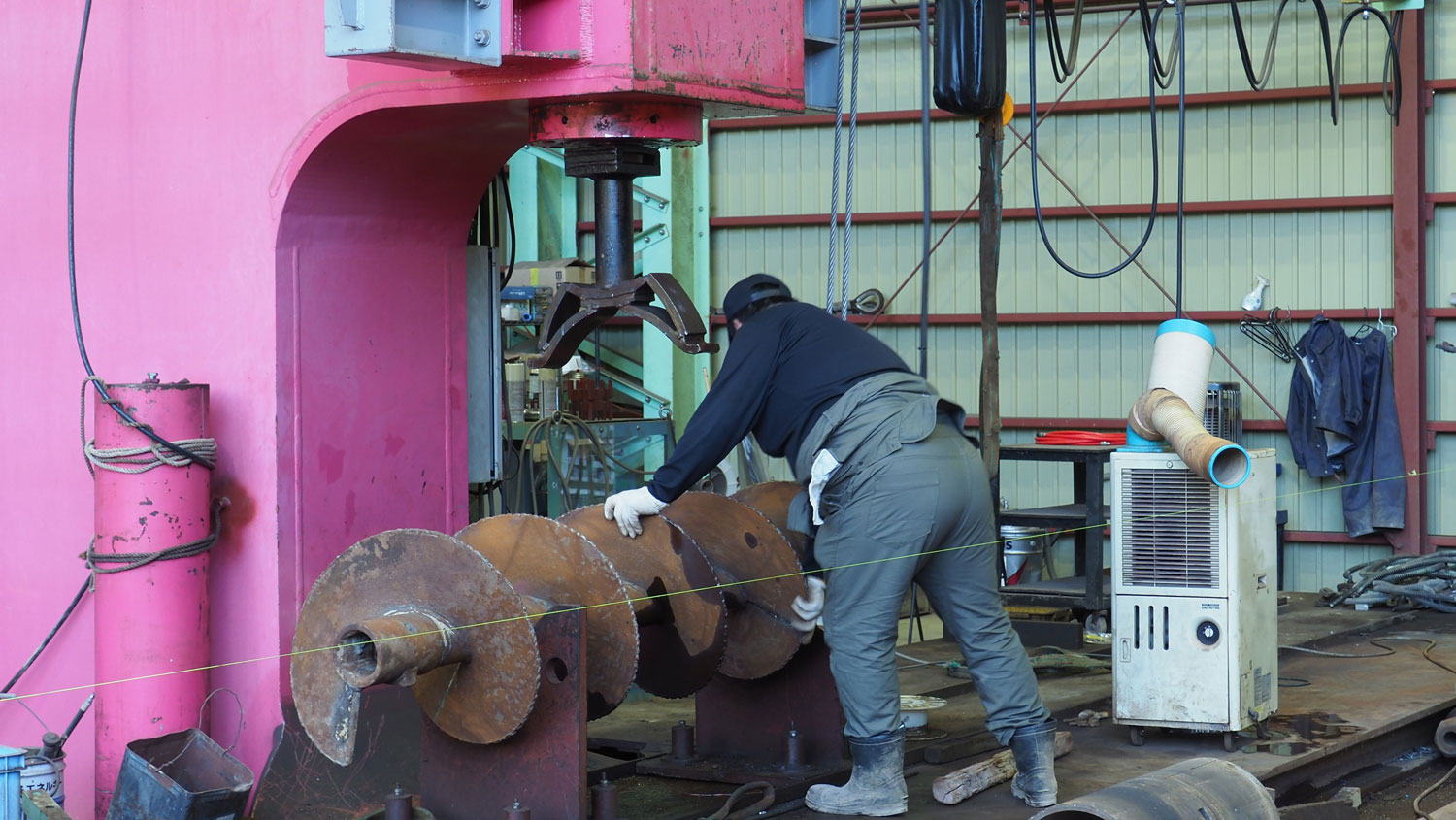 現場で曲がったスクリュー・ロッドを熟練の作業員が特殊機械で復元します。